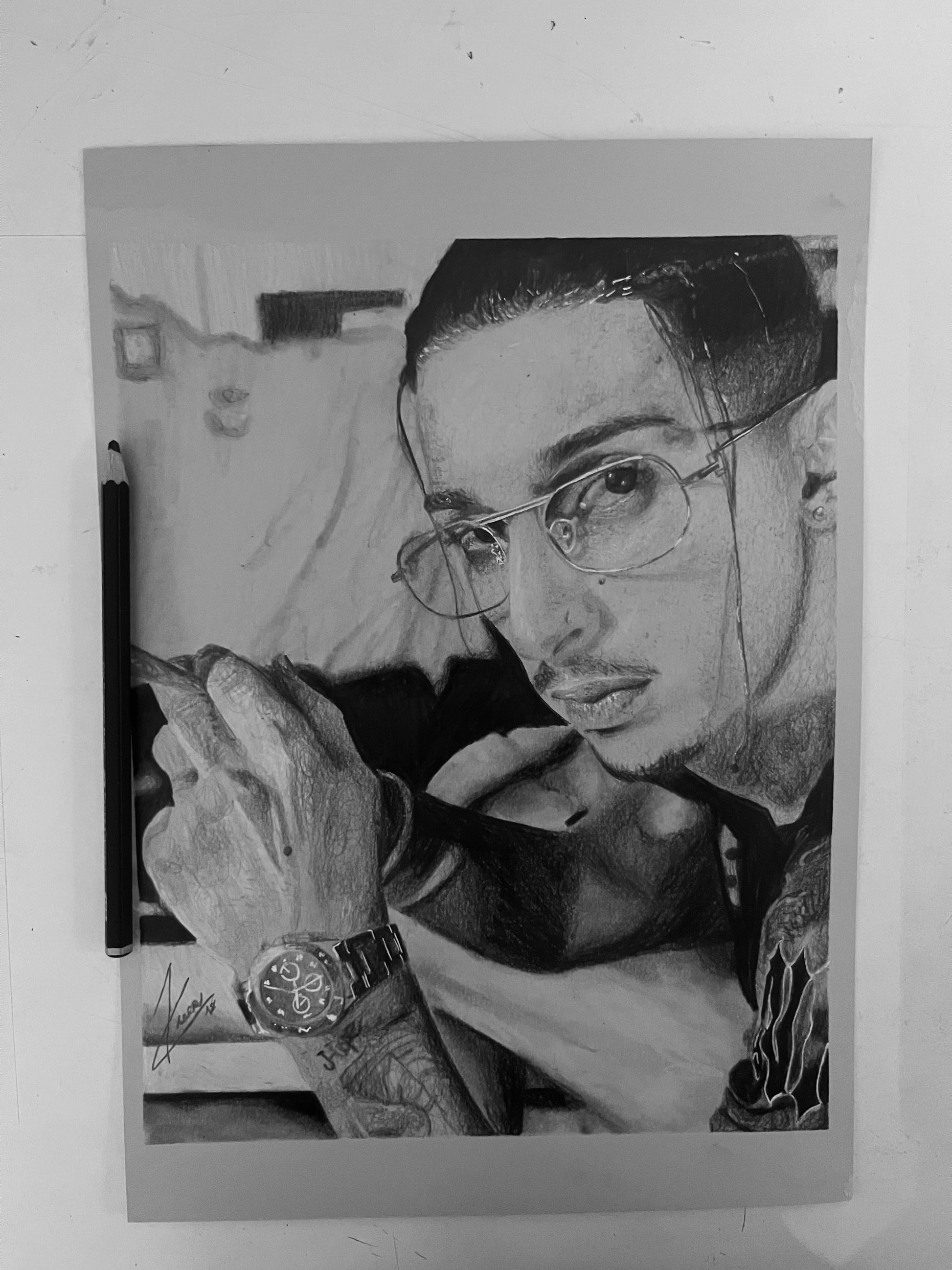 Ritratto di Baby Gang realistico realizzato a matite, foglio A4