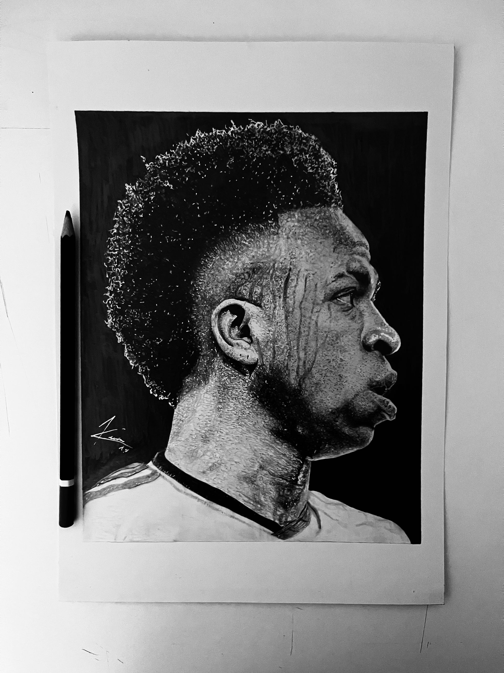 Ritratto Vinicius Jr. realizzato a matite, foglio A4